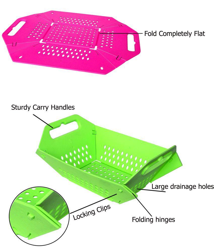 These cutting boards protect your expensive counter top fro, damage resulting from the sharp edge of the kitchen knife.and also use multiple cutting board with storage basket & vegetable washing .easy to lock and storage fruit and vegetable .folding colander is great space saving solution for the kitchen. This patented colander folds completely flat for easy storage in the kitchen. It uses twelve live hinges to achieve its transformation from flat to colander. Once in the locked position food is safely contained in the colander. Made from dishwasher safe polypropylene.